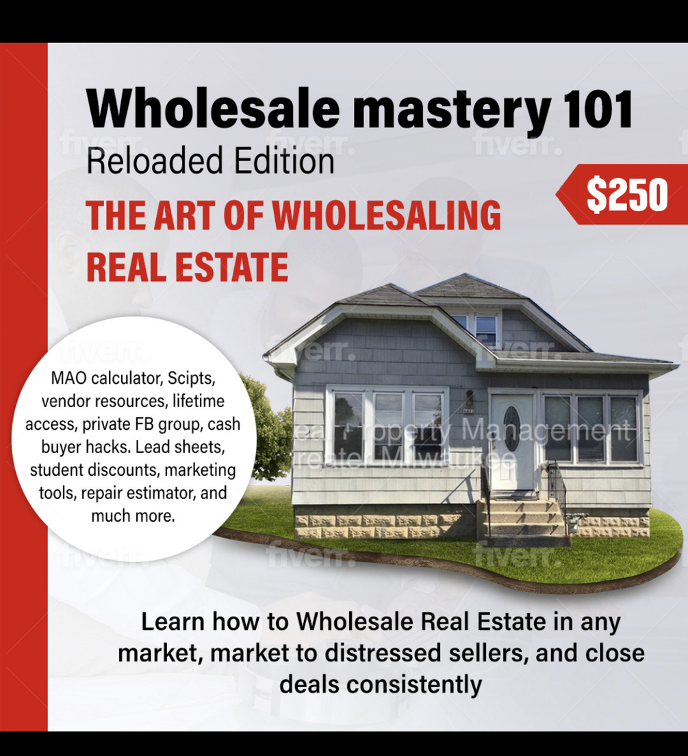 A complete package of tools, strategies, and resources for the aspiring wholesaler. We have reloaded the course with live calls, closing procedures,hedge fund lists, A MAO Calculator, cash buyer hacks, zoom calls, scripts, contracts, video tutorials, JV Agreements, specific marketing lists, LIFE TIME ACCESS TO THE MATERIAL, and more!! Grab yours today and get started wholesaling properties in your market and virtually.